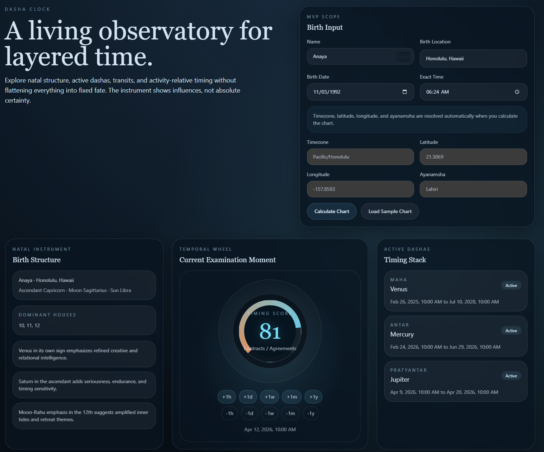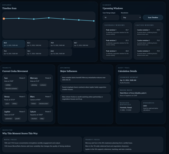 - Combines your birth chart, dashas, transits, and fine time cycles into one interactive timing dashboard.